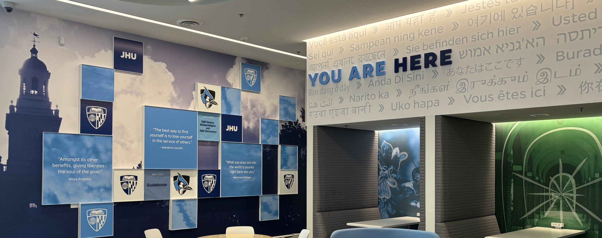 Those are the words we heard most often when we spoke with faculty, staff, students, alumni, and trustees to develop our logo system in 2013 and were reiterated again when we spoke to constituents in 2022. That’s why the Johns Hopkins identity looks the way it does—with the book representing knowledge and discovery, the globe symbolizing our worldwide reach, and the crest of Lord Baltimore indicating our connection to our community.