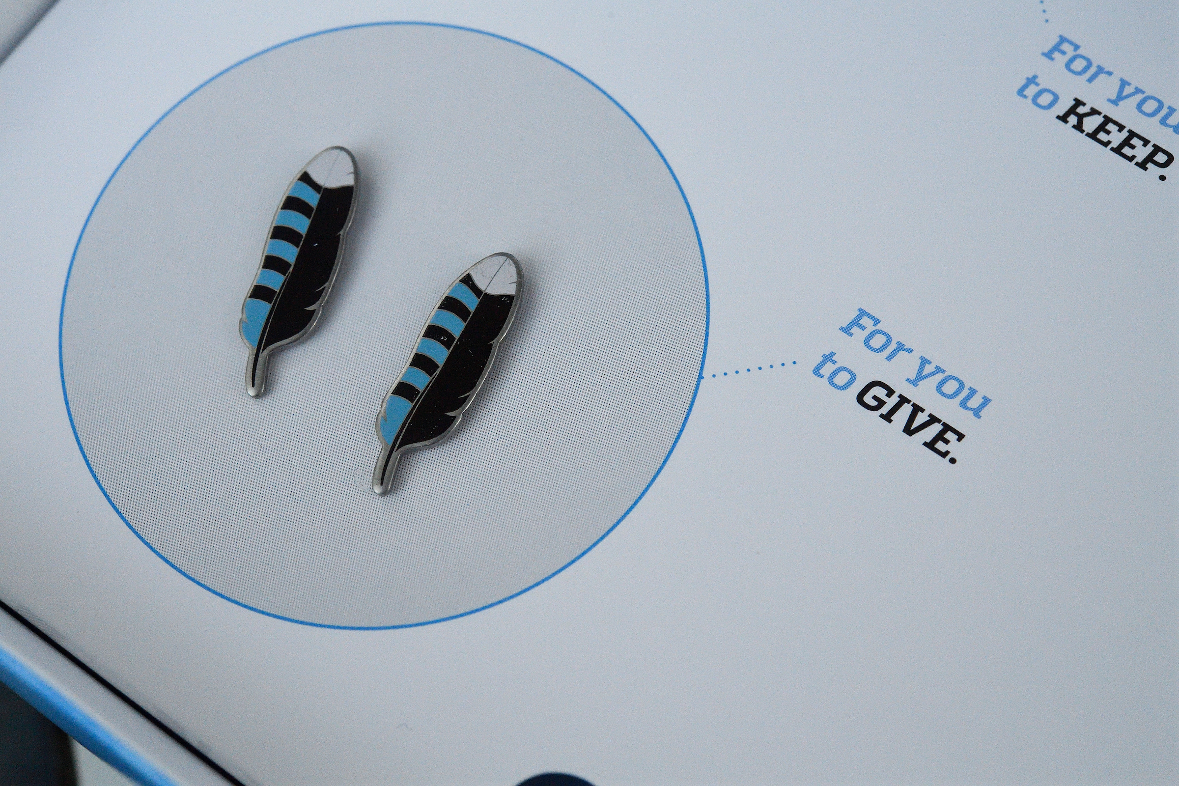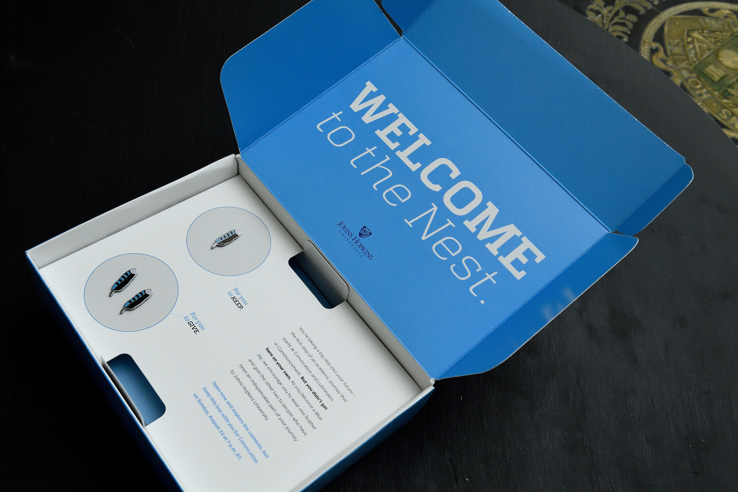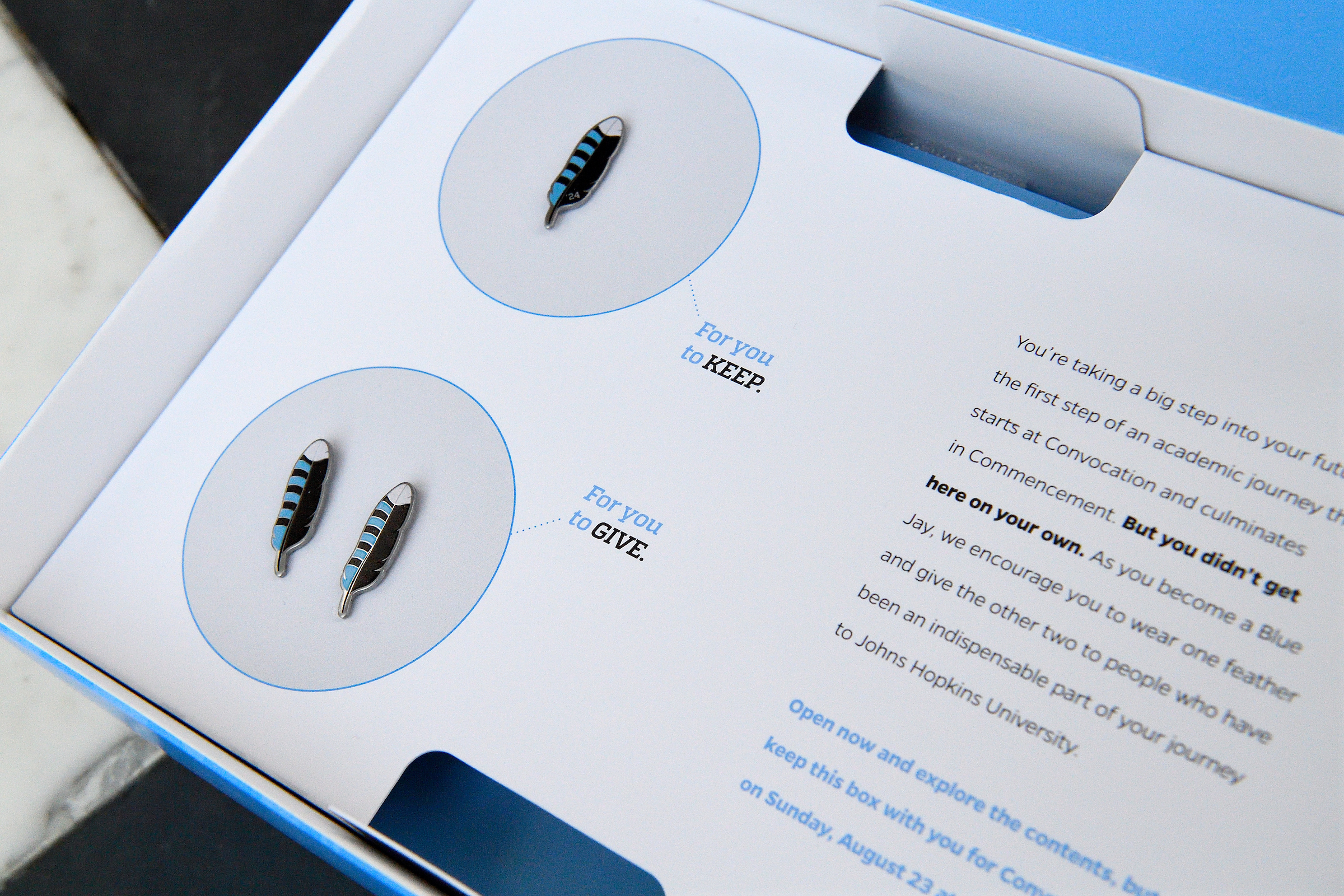 Deliverables & Design Thinking: The set of enamel Blue Jay feather pins draws from our distinct mascot iconography. The selection to include two pins provides a meaningful opportunity for the recipient to acknowledge someone who supported their Hopkins journey.