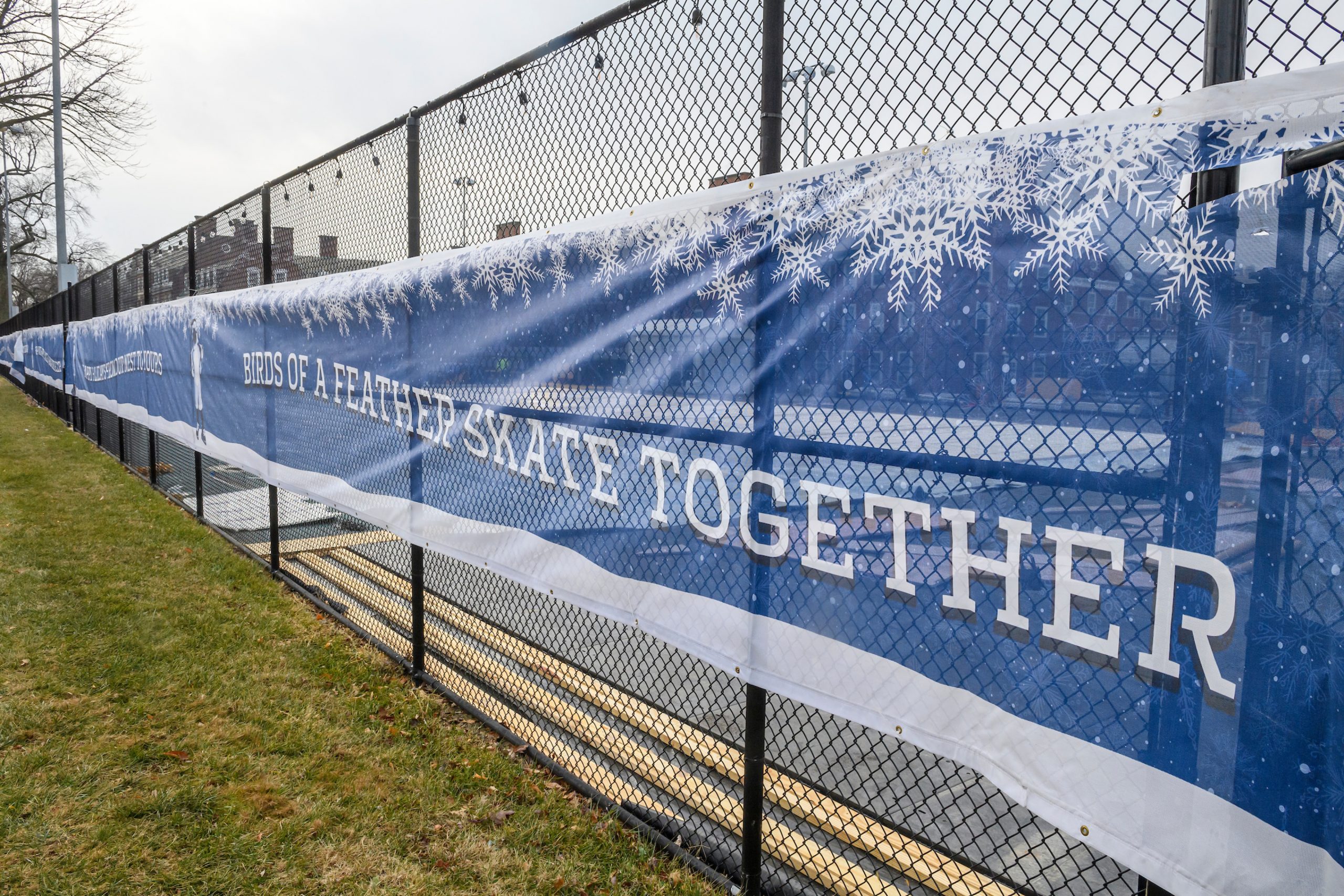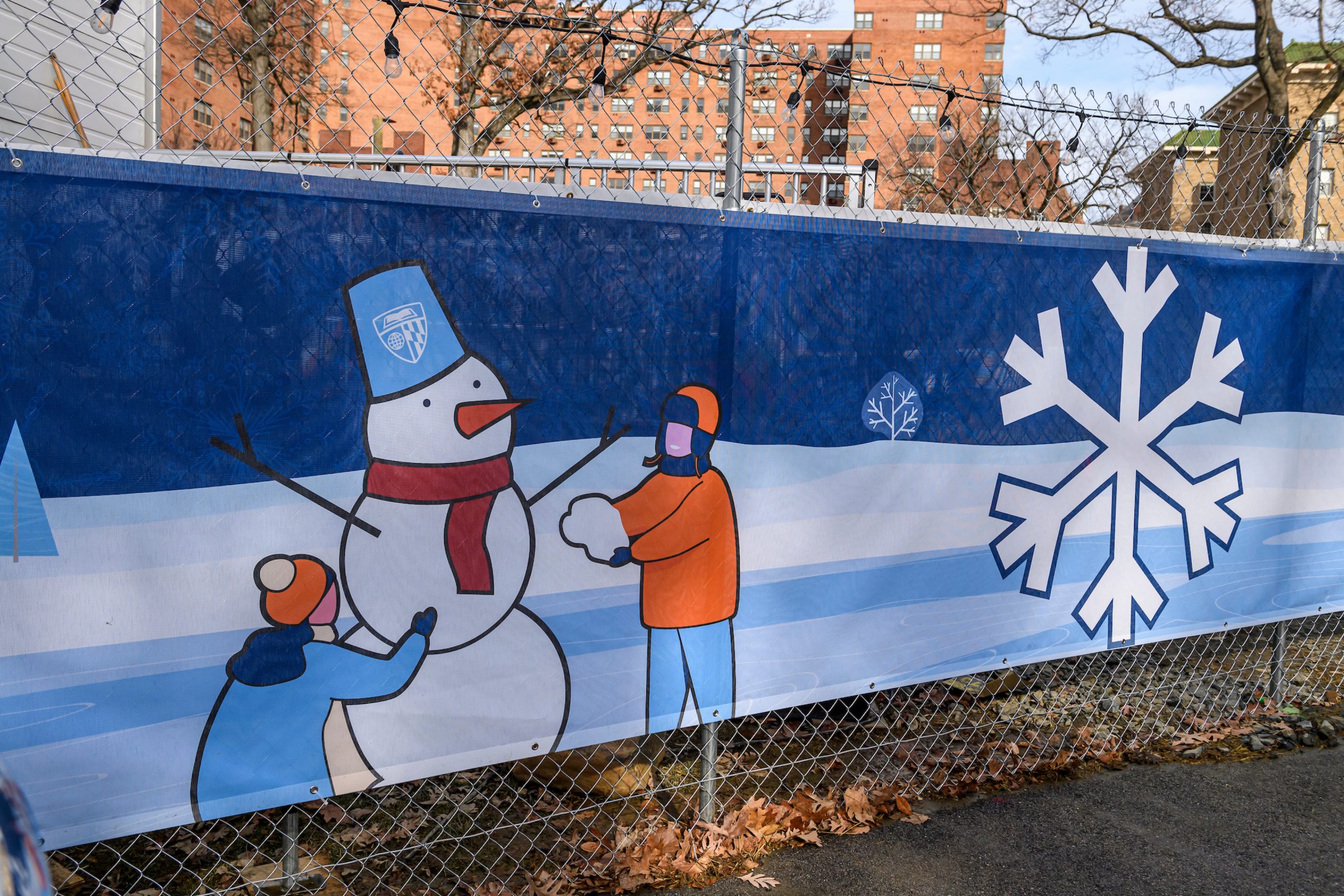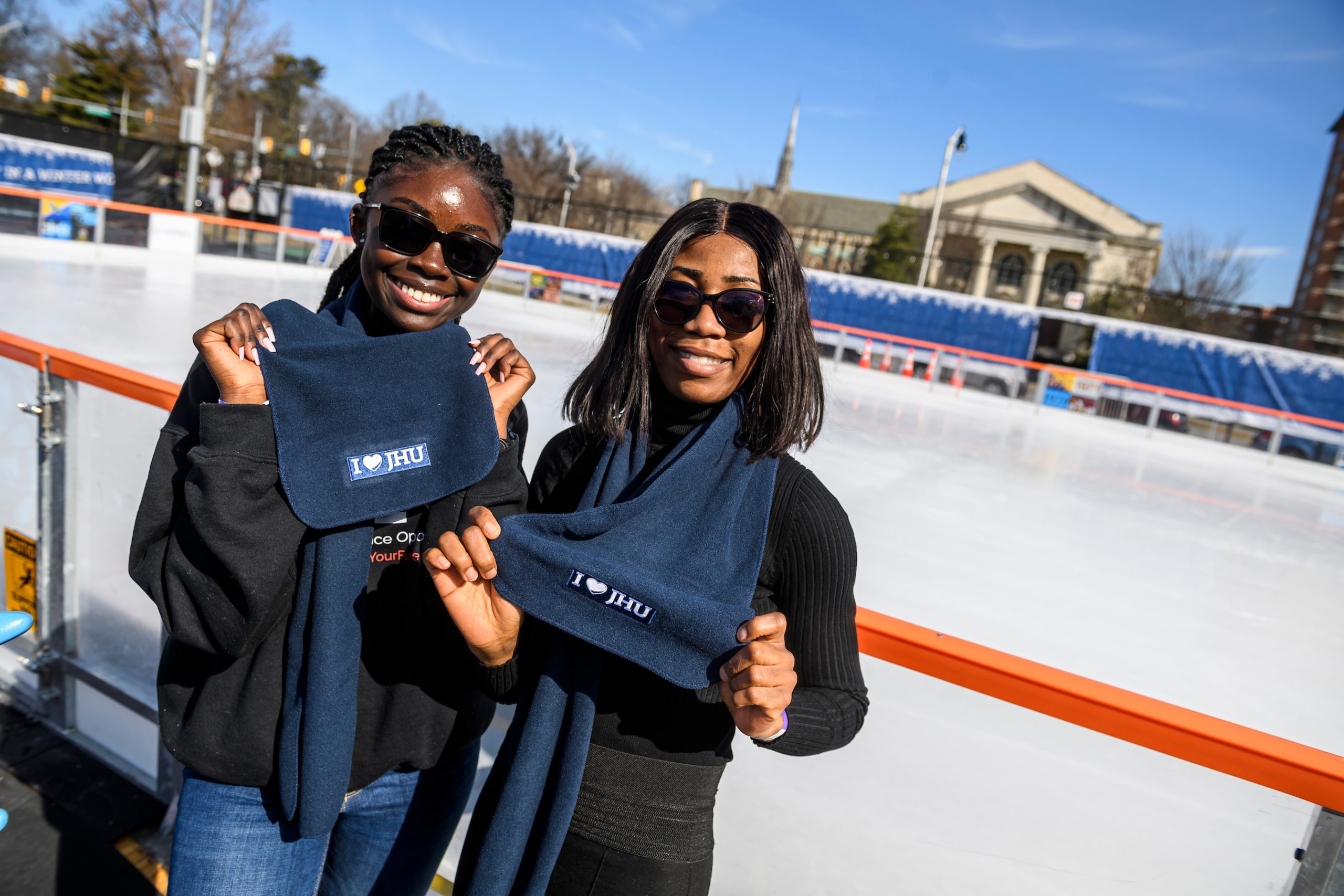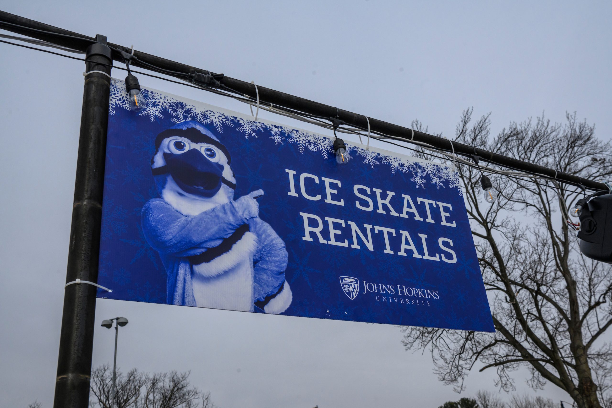Johns Hopkins University opens a campus ice rink during the winter season, transforming a section of the Homewood Campus into a 6,000-square-foot skating surface that is free to all.
