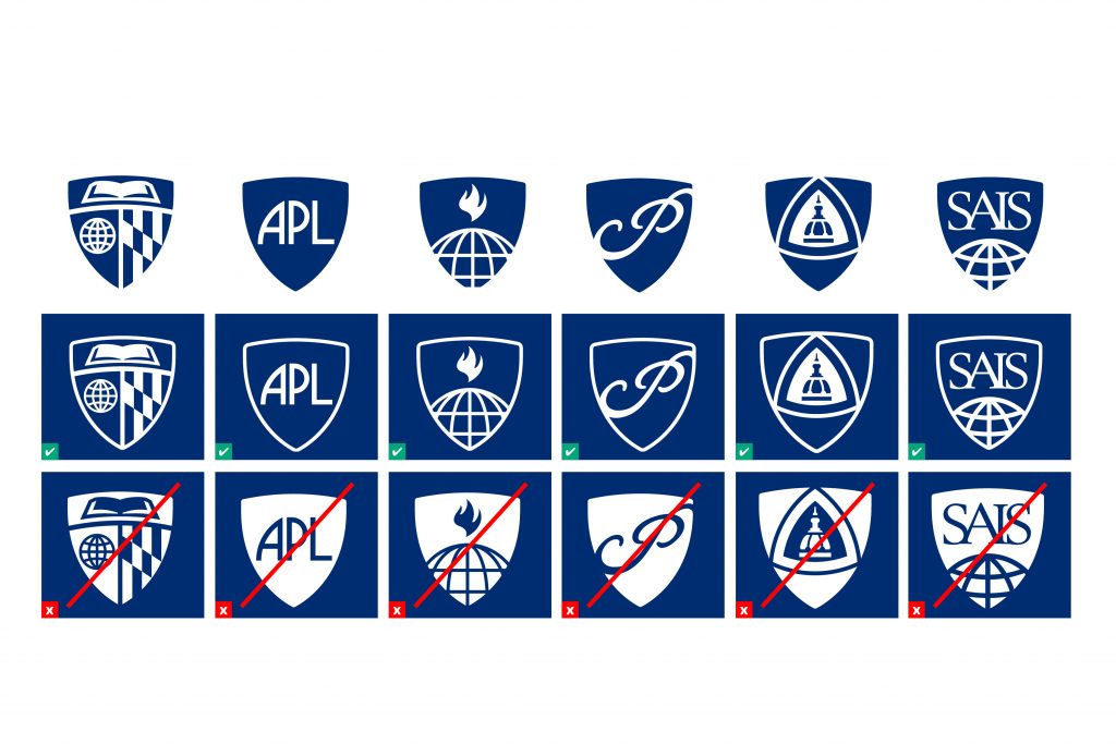 It is essential that we maintain the prominence and recognition of the official Johns Hopkins University logo and its subsidiaries. None of the elements may be altered in any way, nor can individuals create their own logos or shields. Use only the digital artwork provided by University Communications on this website. To avoid introducing additional shields, secondary graphics cannot include or be framed in the shield shape.