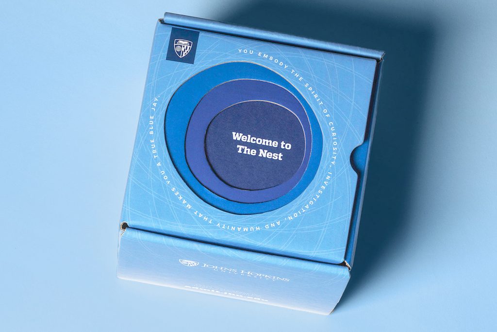 In this admitted student welcome mailer, the shield tag serves as an introduction to the Johns Hopkins brand, working in conjunction with the primary Johns Hopkins logo on the adjoining panel.