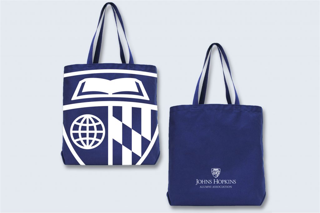 The shield mark works well by itself on merchandise due to its scalability. Whether it’s being used at a small size on a pen or large size on a tote bag, the shield maintains legibility and is a recognizable brand element. When possible, we recommend including the Johns Hopkins logo in a secondary imprint location.